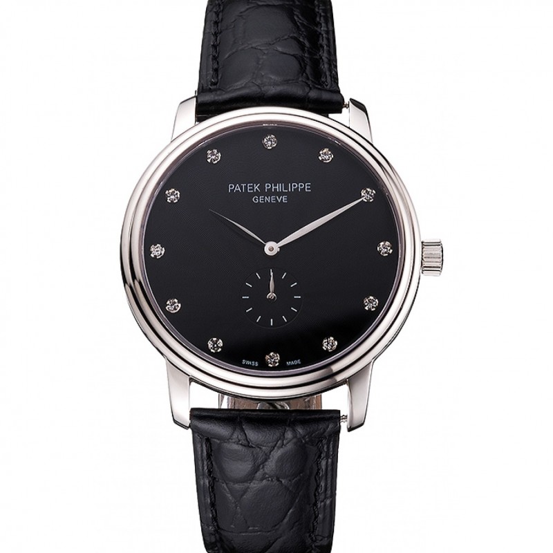 Patek Philippe Calatrava quadrante nero Doppio coste Lunetta Cassa in acciaio nero cinturino in pelle