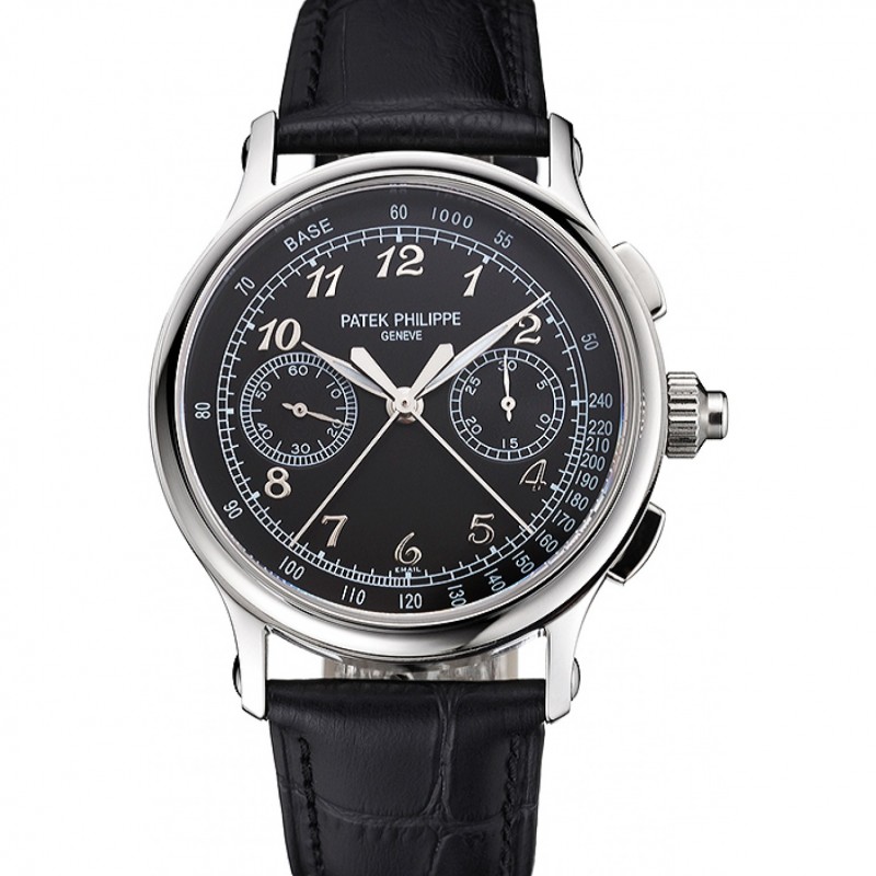 Secondi svizzera Patek Philippe Chronograph Split quadrante nero Cassa in acciaio nero cinturino in pelle