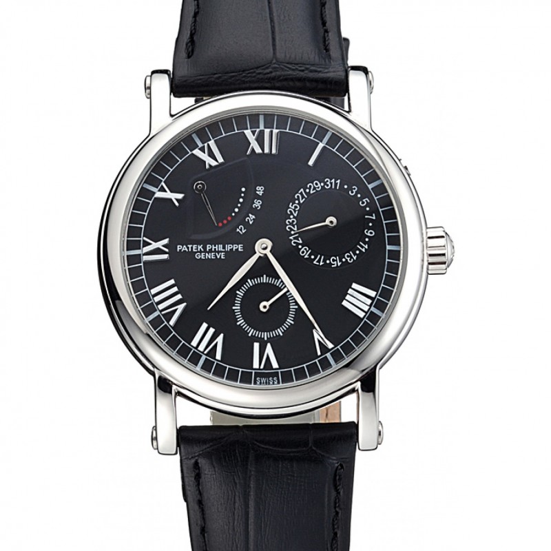 Complicazioni Patek Philippe Geneve quadrante nero lunetta in acciaio inossidabile nero della fascia del cuoio 622.141