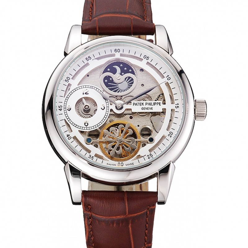 Patek Philippe Dual Time Moonphase Tourbillon scheletrato Bianco Quadrante Cassa in acciaio cinturino in pelle marrone