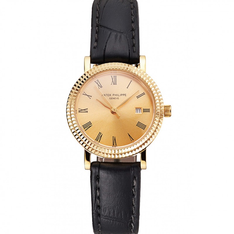 Patek Philippe Calatrava Gold Quadrante numeri romani doppio coste lunetta in oro nero di caso cinturino in pelle