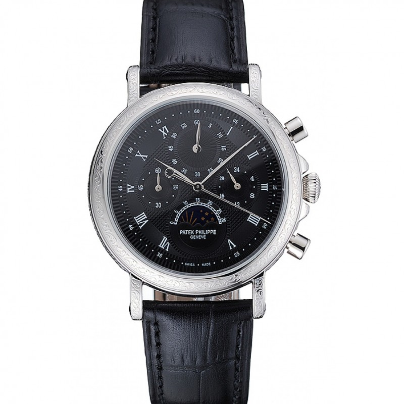 Patek Philippe Grand Complicazioni quadrante nero il braccialetto di cuoio inciso argento nero della cassa 1454145