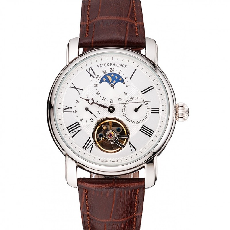 Patek Philippe Grand Complicazioni Moonphase Tourbillon Calendario Perpetuo quadrante bianco Cassa in acciaio cinturino in pelle marrone