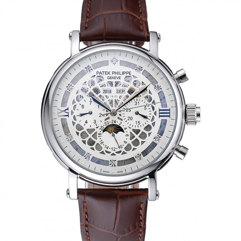 Patek Philippe Grand Complicazioni Calendario annuale quadrante bianco Bracciale in pelle Diamante Numeri Brown 1454234