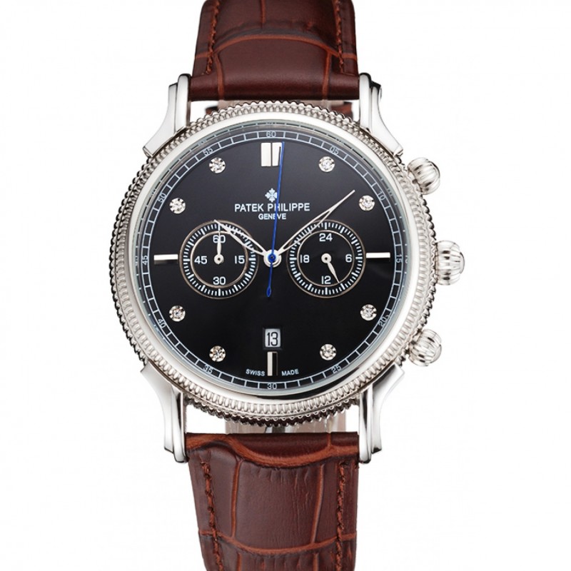Patek Philippe Chronograph quadrante nero con diamanti Cassa in acciaio cinturino in pelle marrone