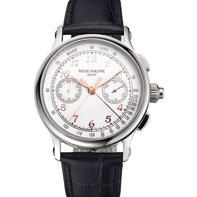 Secondi svizzera Patek Philippe Chronograph Split quadrante bianco Rose Gold Hands Cassa in acciaio nero cinturino in pelle