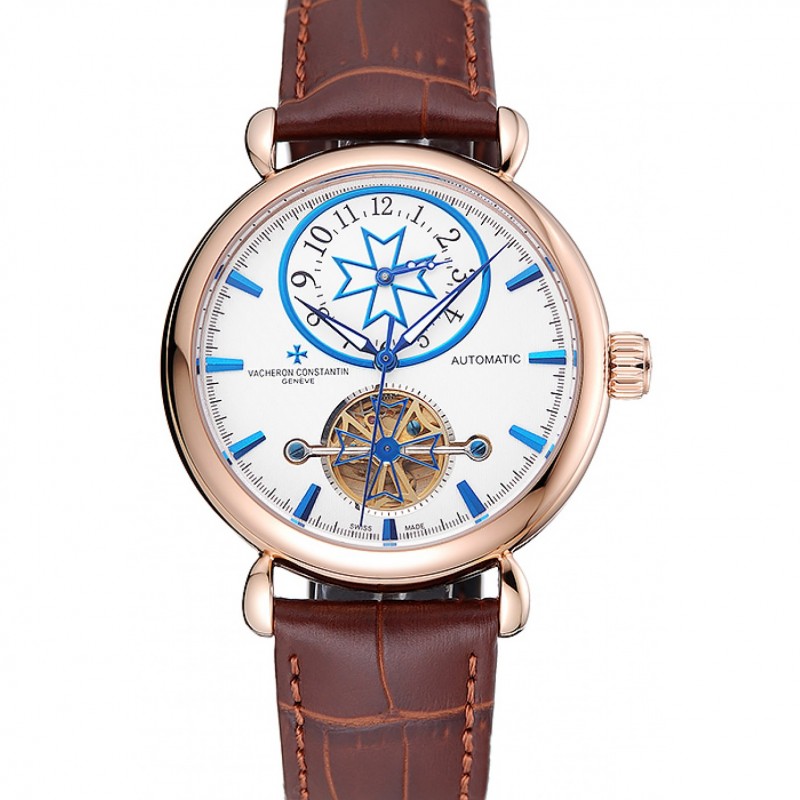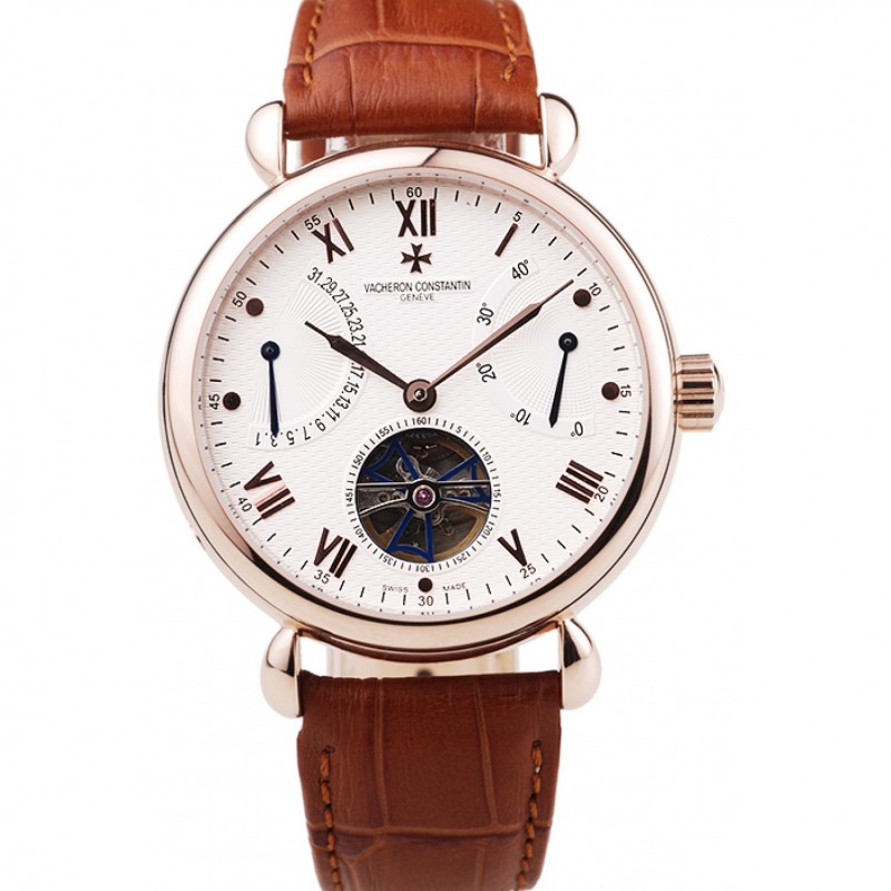 Vacheron Constantin Tourbillion quadrante bianco il braccialetto di cuoio cassa in oro rosa Brown